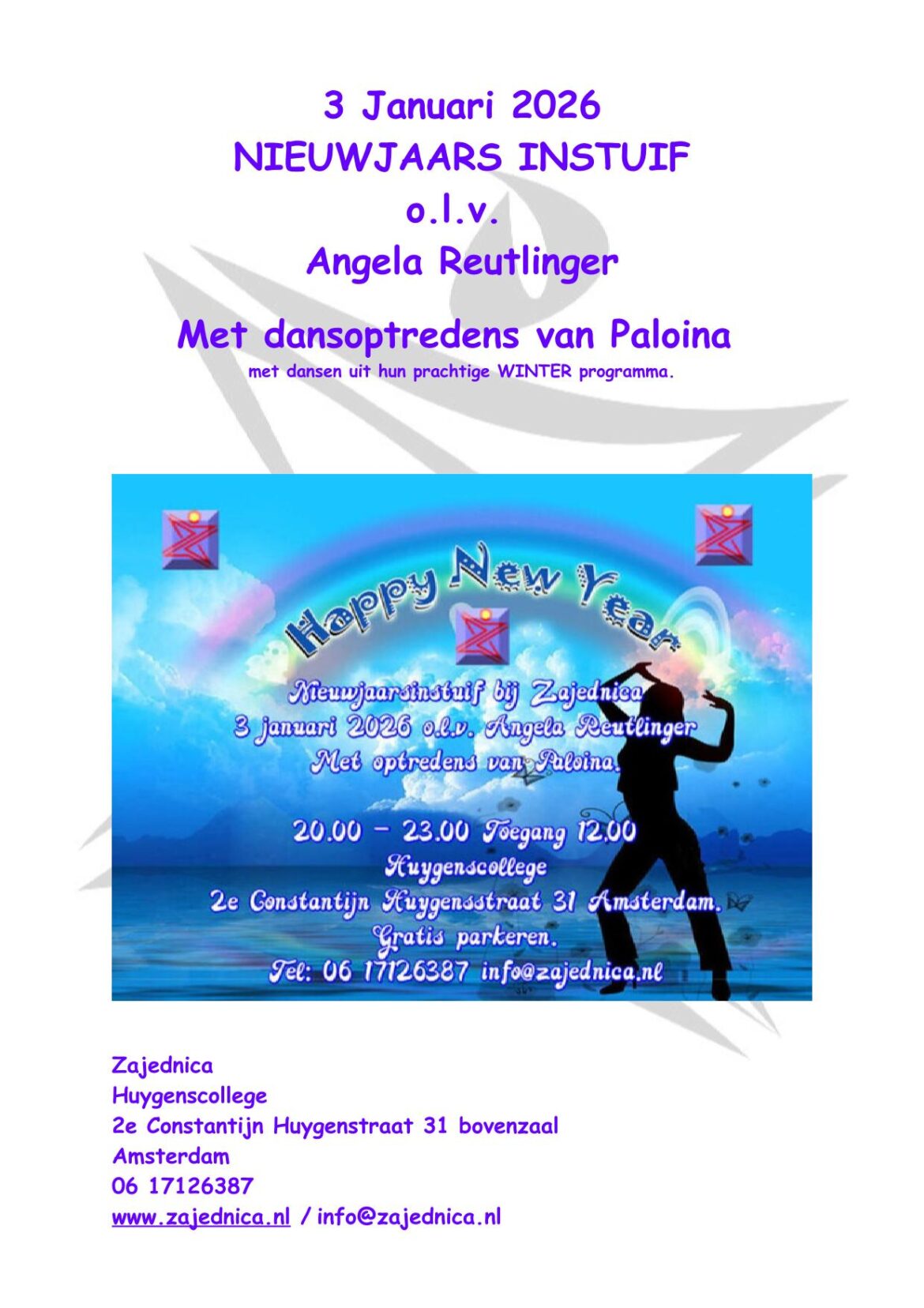 | 03 jan. | Nieuwjaarsinstuif | Angela Reutlinger | 20.00–23.00 | 12,00 | Met optreden Paloina | zaterdag |